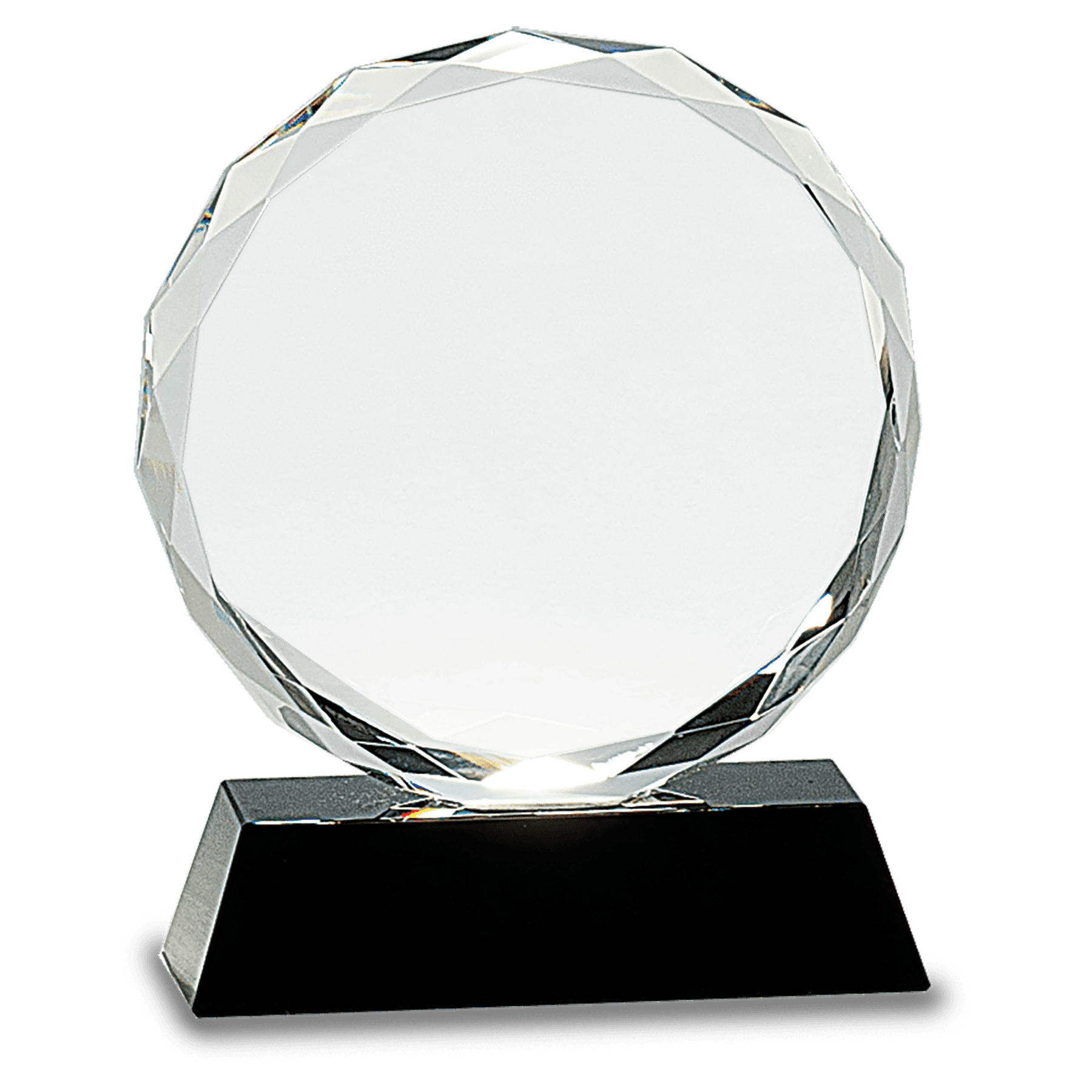 Our Premier Crystal Awards are handmade and may vary slightly in size. Round facet optic crystal piece attached to black pedestal base. Packaged individually in a lined gift box. Premier Crystal is the ultimate way to recognize and honor!