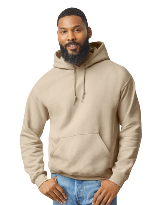 The Gildan Adult Heavy Blend™ Hood excels in comfort and adaptability. Crafted from a 50/50 cotton-polyester blend, this hoodie features a double-lined hood, pouch pocket, and spandex ribbed cuffs.