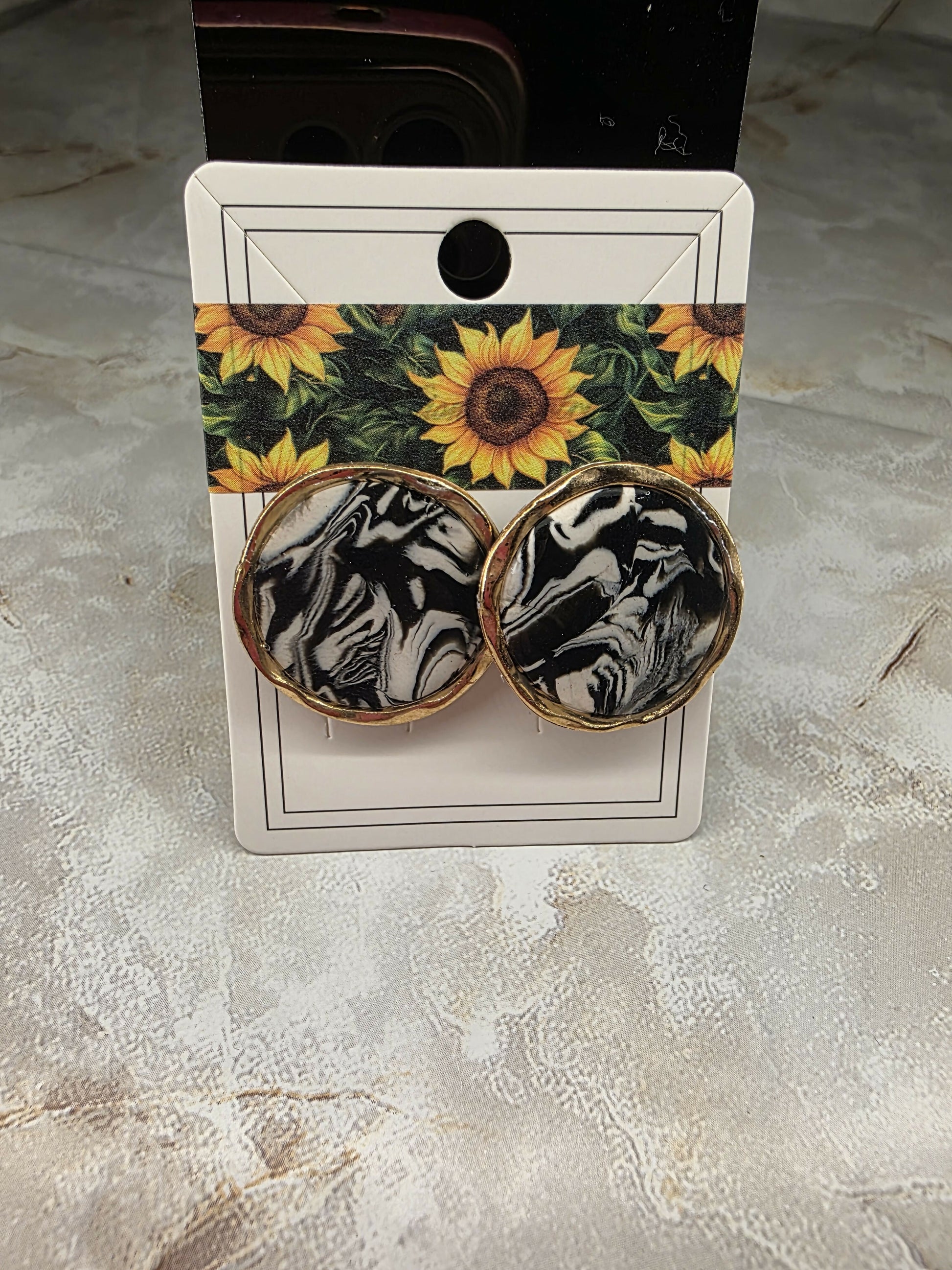 These earrings are made with polymer clay and gold circle embellishment with a resin overlay to seal it. The studs are hypoallergenic.