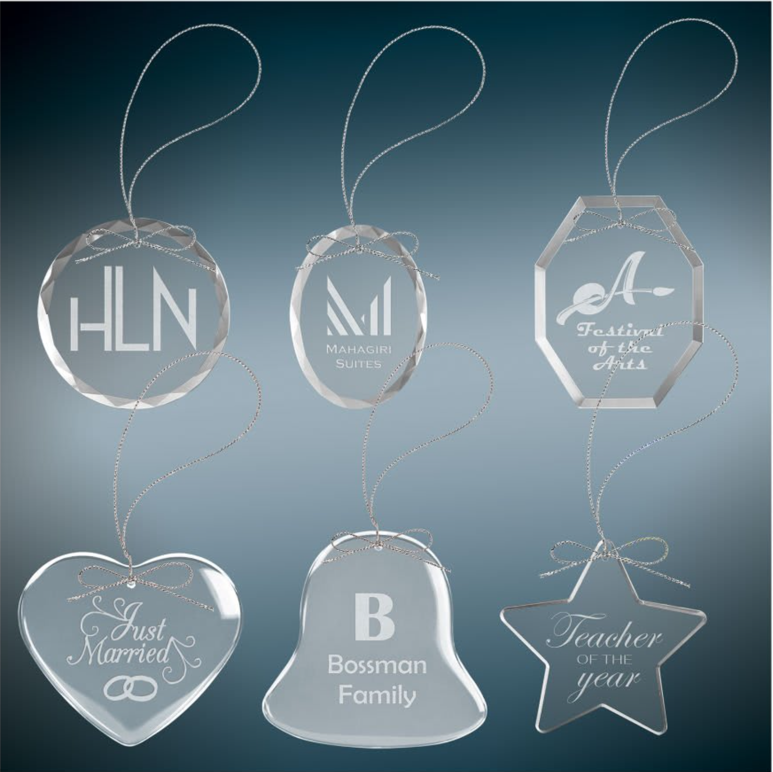 These crystal ornaments can be engraved with almost anything you desire. It will look great with a family name, family crest, business logo, or any design you would like.