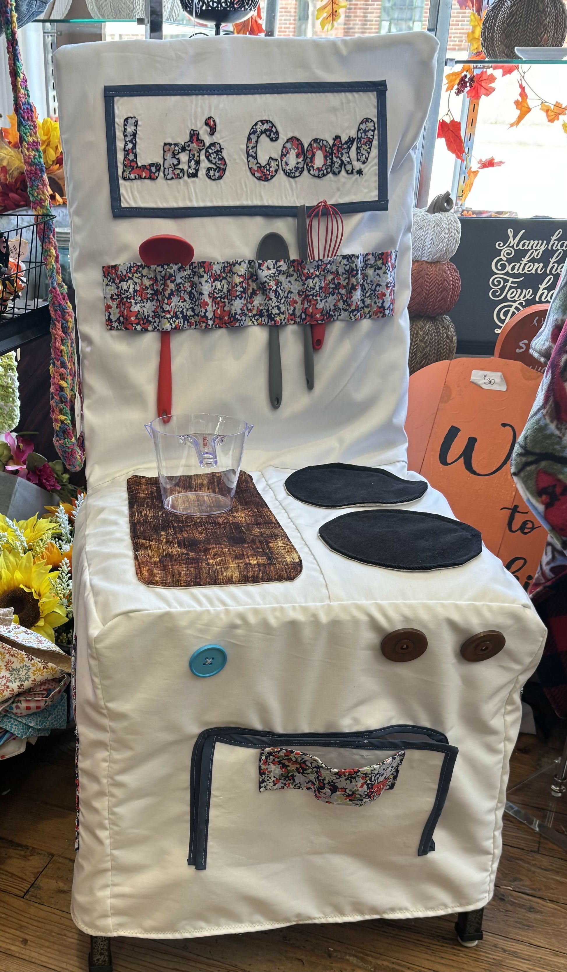 Handmade cloth slipcover turns a regular dining chair into a play kitchen with oven door that opens. When you’re done just fold it away for storage. Will take orders.