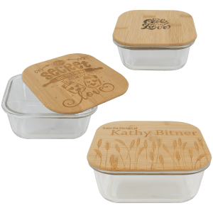 These glass containers are available in square shape and in several convenient sizes. The glass containers are dishwasher, microwave, and oven safe. Personalize the bamboo lid to create custom gifts, incentives, or promotional items. They're also great for fundraisers and gift or souvenir shops!