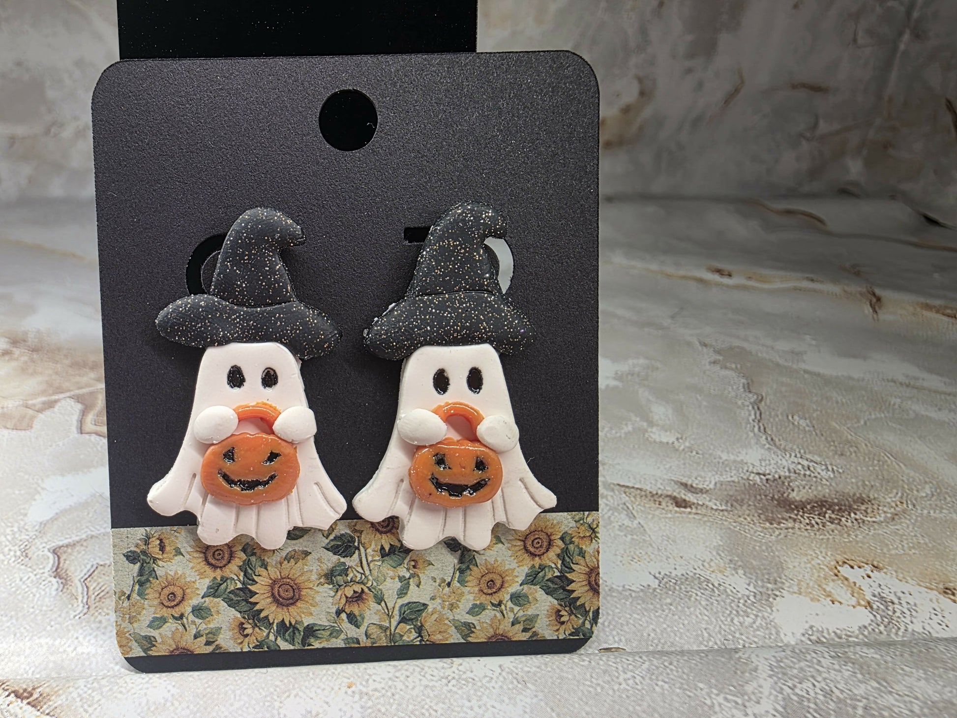 These earrings are made with polymer clay to look like adorable witchy ghosts. The studs are hypoallergenic.